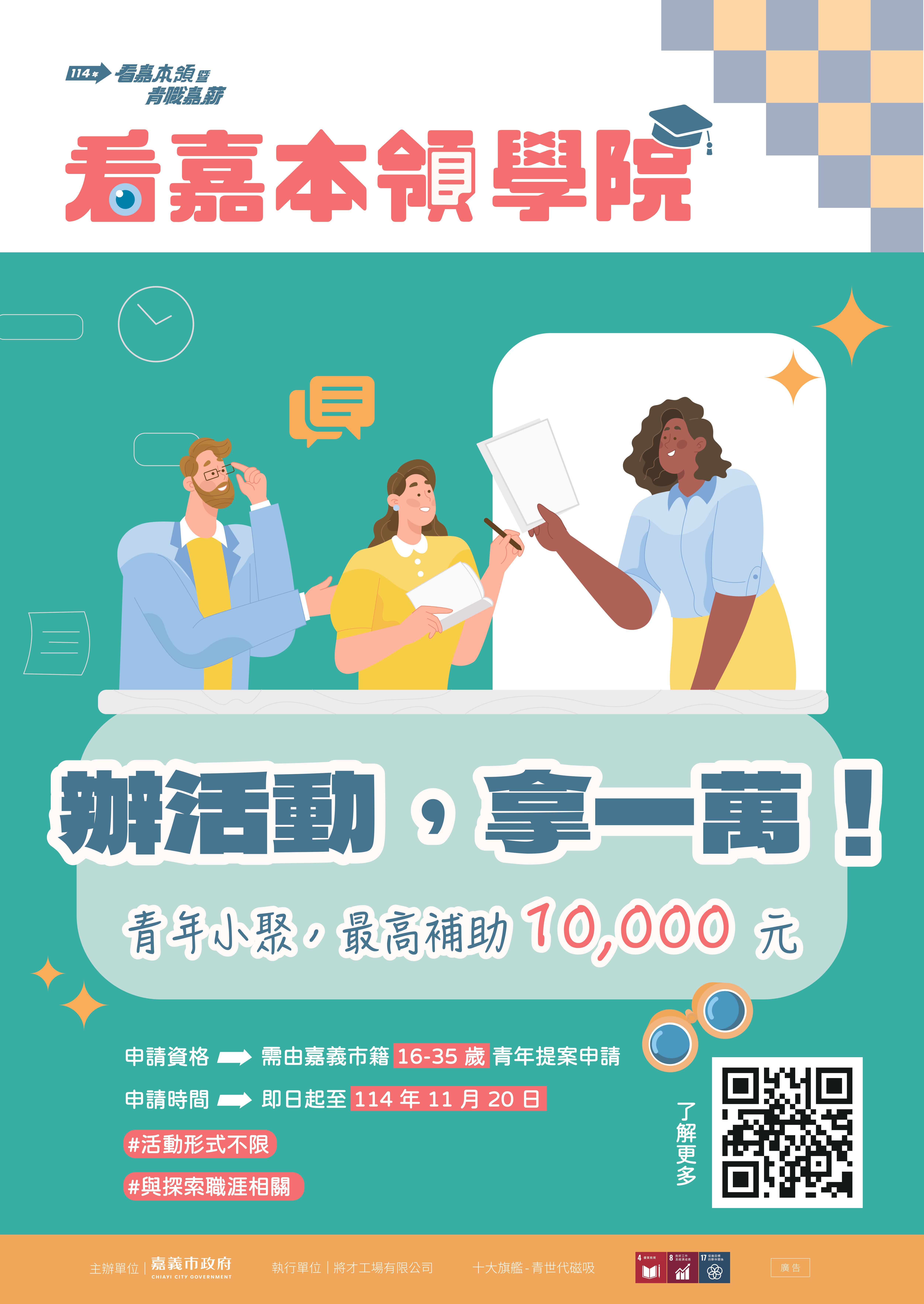 - 其中青年小聚為鼓勵設籍本市或欲於嘉義縣市就業且年滿16歲至35歲青年「自主提案」,協助青年於畢業或就業前後做好準備,以順利投入職場,並促進青年同儕間的互助與串聯,使青年間串起緊密的關係網,增加青年在職涯上的自主生存能力外,擾動不同產業領域參與者,故提供每案最高新臺幣1萬元整之補助,114年預計錄取15件提案,隨到隨審,提案規定詳如附件作業要點。