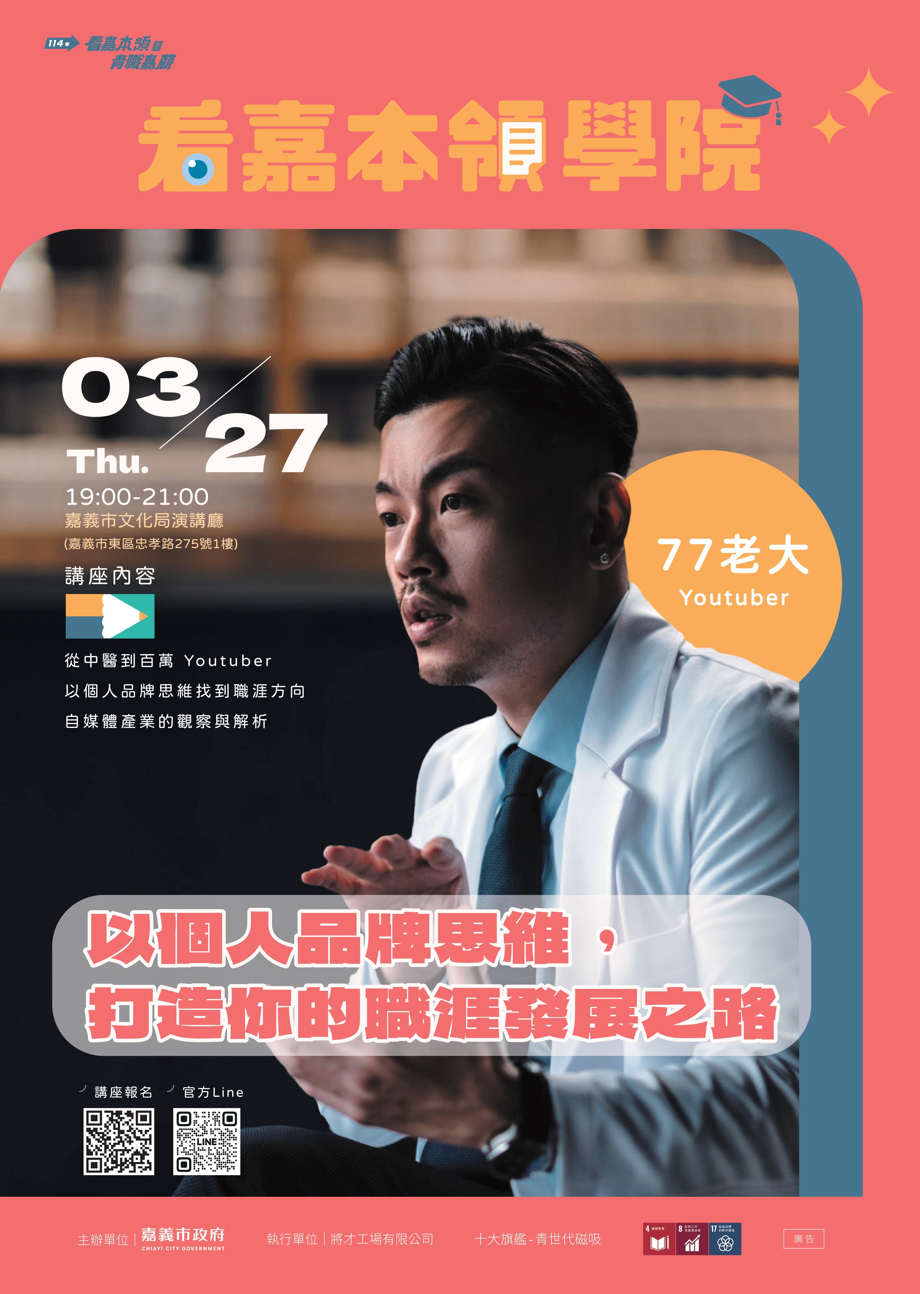 【轉知】嘉義市政府函轉府「114年看嘉本領暨青職嘉薪計畫」青年小聚活動補助作業要點及名人講座活動,歡迎同學踴躍報名參與。