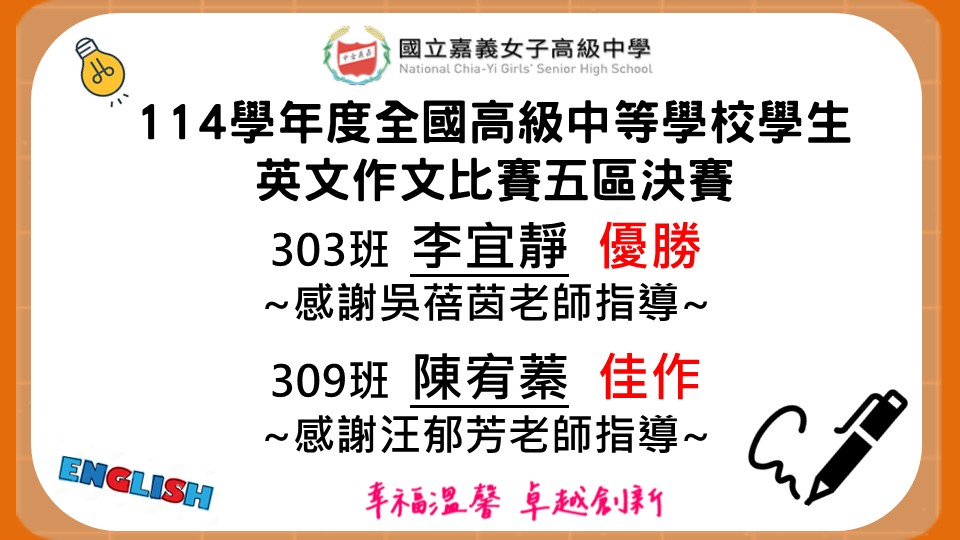 114學年度全國高級中等學校學生英文作文比賽五區決賽