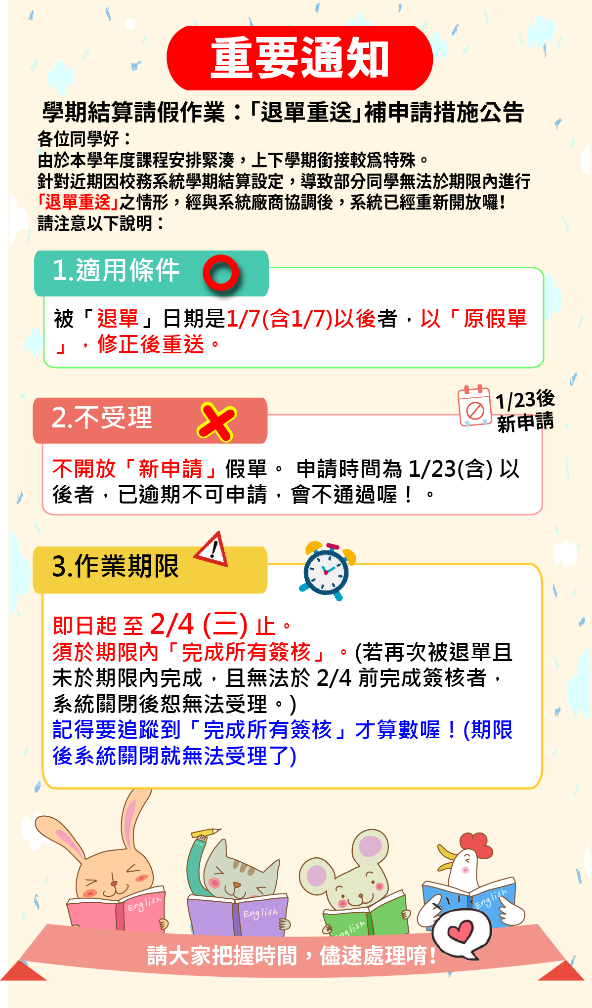若重送後再次被退單,且無法於 2/4 前完成所有簽核流程者,系統關閉後將無法再受理。請各位同學把握時間,儘速處理! -
