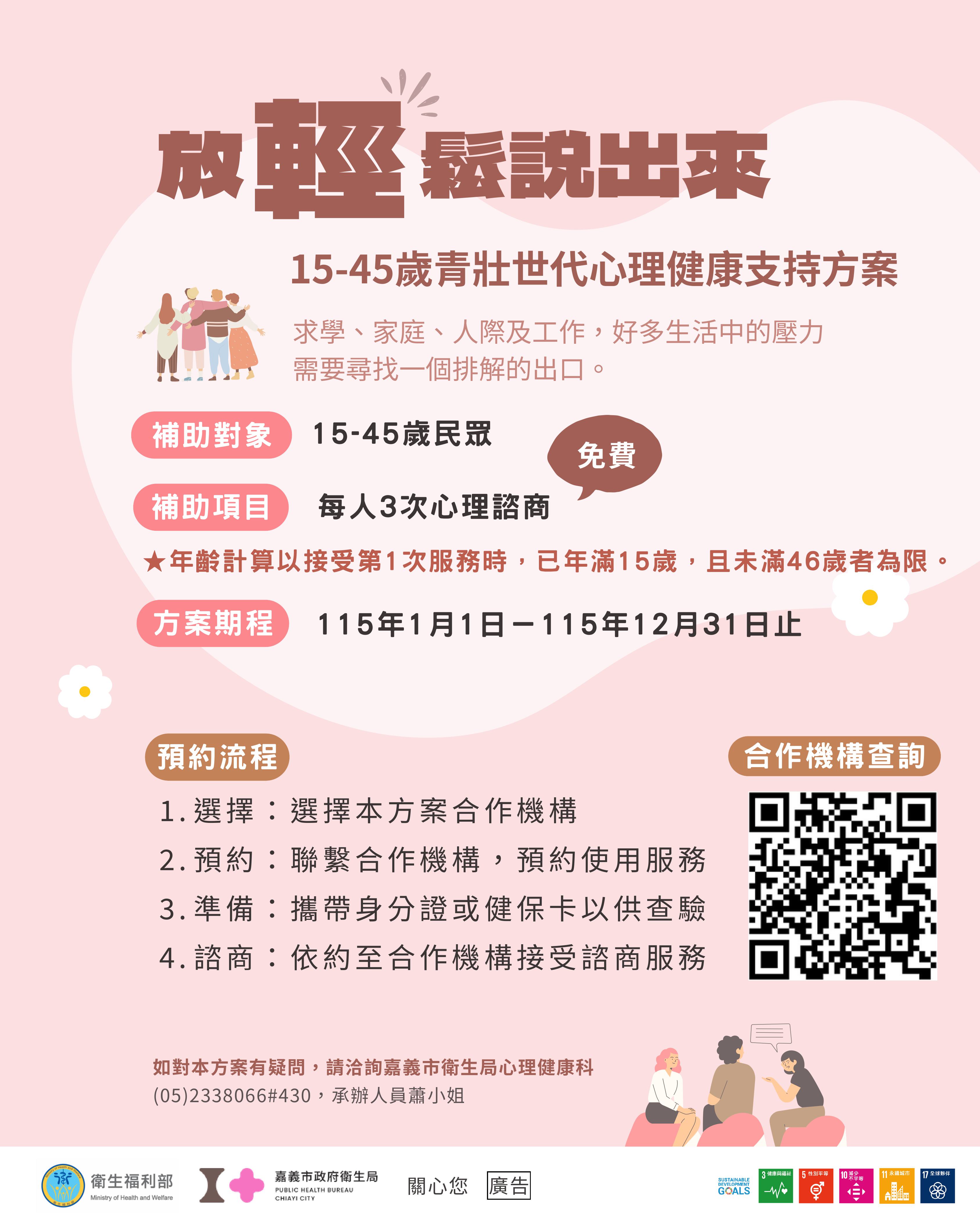 【轉知】嘉義市政府辦理115年度「15-45歲青壯世代心理健康支持方案」,邀請全校教職員及師生協助宣傳並善加運用。